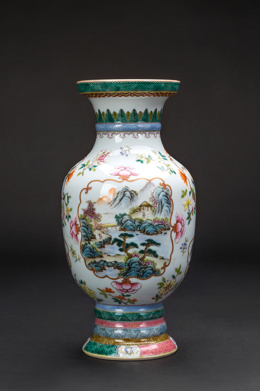 珐琅彩瓷器是清代康熙、雍正、乾隆三朝极为名贵的宫廷御用瓷器,清代珐琅彩瓷器制作极其考究,极费工时、成本,全由皇家垄断。该瓶胎质细腻洁白,釉面莹润,色泽鲜亮而柔和,多层次的绘制了山峦、亭台楼宇、花卉等图案,体现出了清乾隆时繁荣华丽、富贵的风格。底部露胎,底书“大清乾隆年制”六字青花款,为清乾隆朝珐琅彩中典型器。